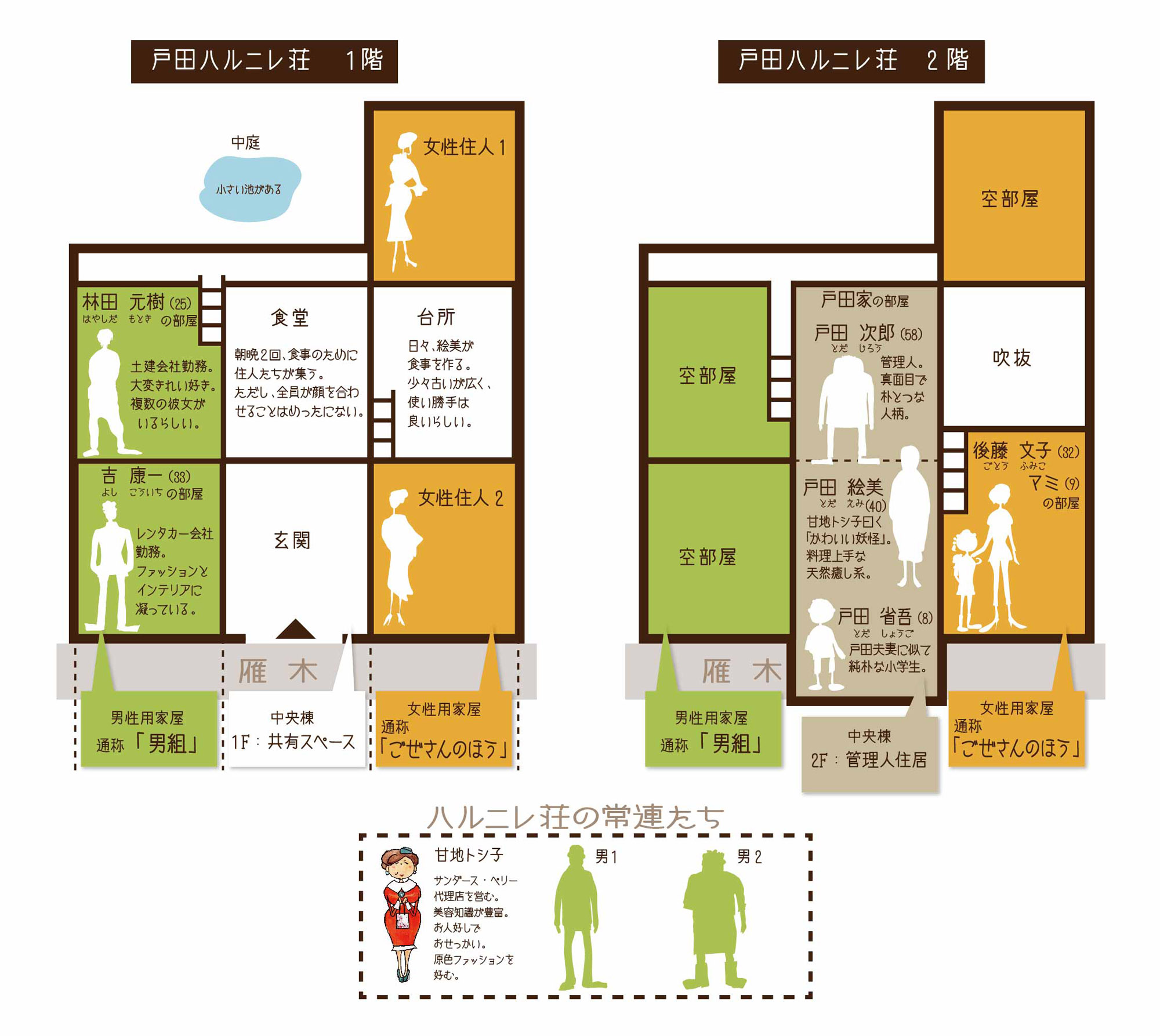 1階は「食堂」と呼ばれ、朝晩2回、食事のために両隣りの棟から住人たちが集まってくる。2階に居住する夫の次郎と15ほど年下の妻・絵美。この2人は気質が似通っており、生来の楽天家だ。夫婦には小学生の息子が1人。取るに足らない些事も恥ずかしがり、耳まで赤くする。はにかみ顔は子供も大人も引き寄せる。この子供の内にある芯はまだまだ柔く、形も定まらない。名は、省吾という。